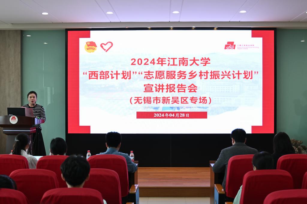 为深入学习贯彻习近平新时代中国特色社会主义思想和党的二十大精神,引导和鼓励高校毕业生积极投入基层建设与乡村振兴火热实践中,4月28日下午,2024年江南大学“西部计划”“志愿服务乡村振兴计划”宣讲报告会(第七场无锡新吴区专场)在食品学院D912报告厅举行。无锡市新吴区团区委副书记林星州、食品学院分团委书记李金杰、毕业班辅导员王文燕出席活动,100余名应届毕业生及在读研究生共同参加活动。宣讲会由本科生辅导员曹敏主持。
