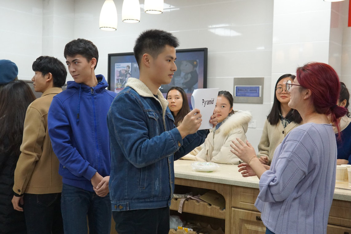 接下来,在等待饺子出锅的过程中,主持人带领大家玩了“传声筒”的游戏。每个小组由中国学生和留学生组成,第一位同学将看到的英语单词用肢体语言表现出来,后面的组员依次模仿,最后一位同学根据猜测将该单词说出来。游戏过程中,中外同学配合默契,进展顺利,现场气氛被推向高潮。