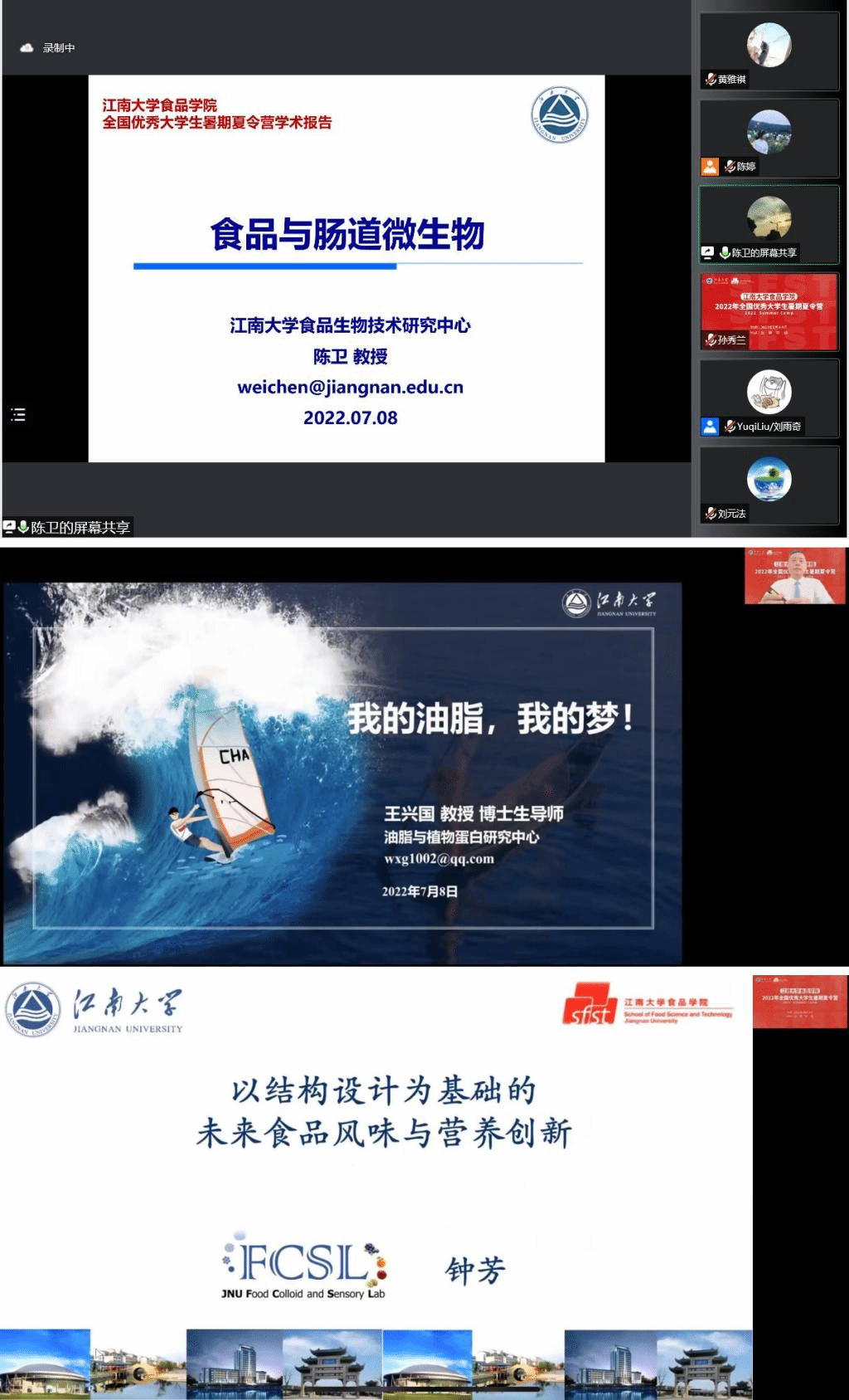 为了让营员们进一步感受学术氛围,本次夏令营特别邀请三位学术大咖为同学们带来学术盛宴。中国工程院院士、江南大学校长陈卫教授作《食品与肠道微生物》主题报告,他具体剖析了人体肠道微生物的概述、肠道微生物的研究进展、食品与肠道菌群,系统讲解了肠道微生物的结构组成和分布规律,分析其对人体健康的作用,从微生物学、免疫学、神经科学、药学、临床医学等方面介绍了肠道微生物的学科前沿进展。他表示,肠道菌群是食品科学的重要研究领域,期待更多的食品科技工作者参与研究,共同推动该领域研究发展。食品学院王兴国教授作《我的油脂,我的梦》主题报告,他与同学们分享了自身的科研经历,结合浓香花生油规模化安全生产、油脂脱色关键共性技术、磷脂系列产品加工技术、食品专用油脂创新制造技术等具体案例阐释,探讨了油脂领域未来研究方向,鼓励同学们传承工匠精神,研究好油、制造好油,共筑健康油脂梦。食品学院钟芳教授作《以质构设计为基础的未来食品风味与营养创新》主题报告,她从近年来食品胶体的研究成果出发,以食品质构创新实现减糖与愉悦的双重满足、呈味物质的空间不均匀分布强化味觉感知、营养元素的有效补充-微观结构设计等具体实例向大家介绍感知科学基本概念以及未来发展趋势,为营员们打开了感知科学的大门。