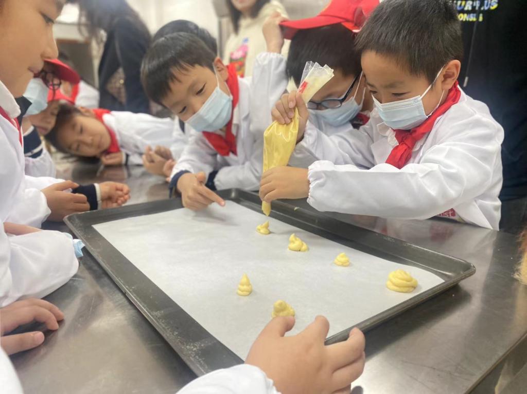 在国家功能食品工程技术研究中心一楼的工艺大厅中,“青芽食育”团队的大哥哥、大姐姐带领小朋友们开展了一场别有趣味的儿童食育科普实践课——制作“酥皮大泡芙”。从学习泡芙的原料成分和制作过程,到亲手做出酥皮外壳、填注奶油馅料,再到亲口品尝自己的创作成果、进行感官评定,一个个“红领巾”在这堂食育课上俨然化身“小小科学家”。