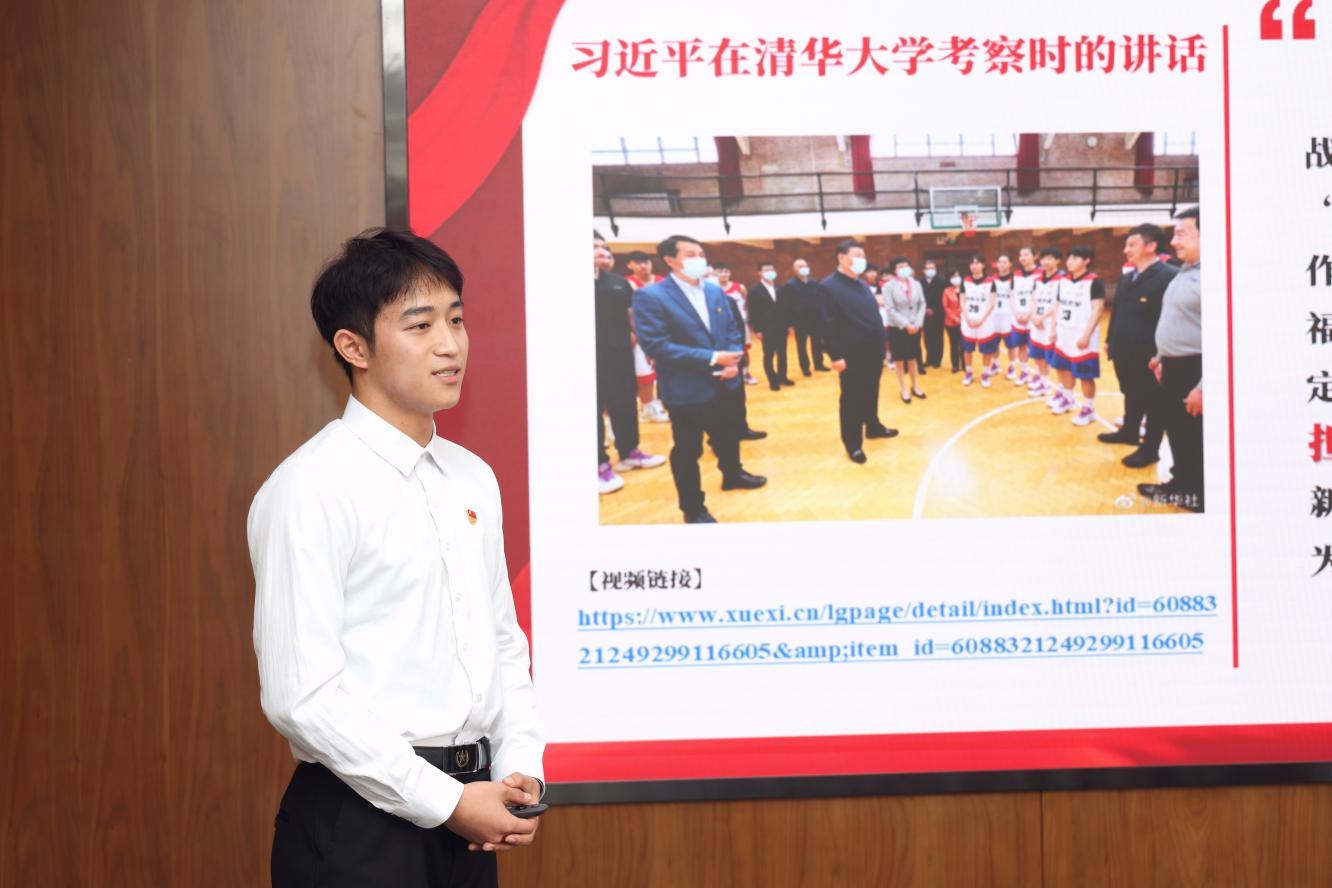 曹敏首先从人员构成、组织建设、作用发挥等方面介绍支部概况。她介绍到,本支部成员均为青年骨干,积极参与学院建设和学生工作,在不同赛道上全面发展,近三年升学深造率均为100%,是一个年轻有为、充满活力、团结向上的集体。