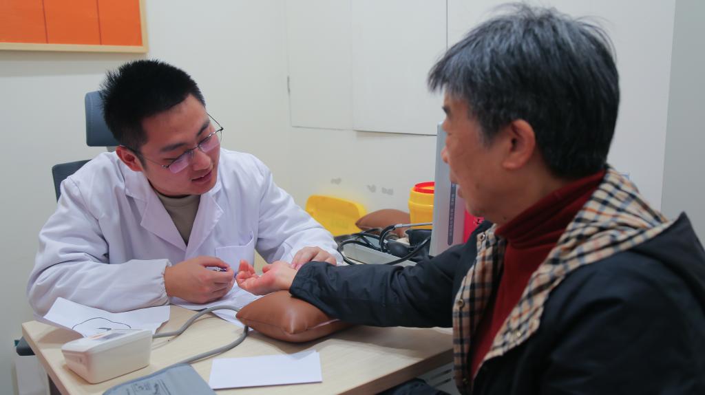 科普讲座结束后,党员同志向公寓老人发放《习近平新时代中国特色社会主义思想》《“健康中国2030”规划纲要》等相关书籍材料,通过问卷调查的方式了解老年人的健康状况、日常饮食和生活习惯等,并给予相应的饮食建议。在活动现场,联盟还组织博士生、中医医师邵家豪及康复理疗师缪春伟为老人们提供健康检查、问诊咨询、理疗推拿等服务。邵家豪结合日常生理指标和望闻问切,从中医角度对老年人日常健康维护给出意见。缪春伟结合二十余年康复理疗工作经验,对存在经络或骨骼健康问题的老年人提供精准理疗服务。