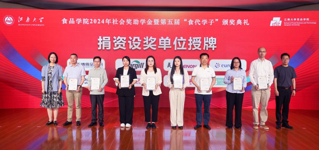 社会联络与校友合作处处长周云龙、食品学院党委书记傅莉莉共同为莅临活动现场的设奖企业和江南大学北美校友会代表颁发奖助学金捐赠证书。