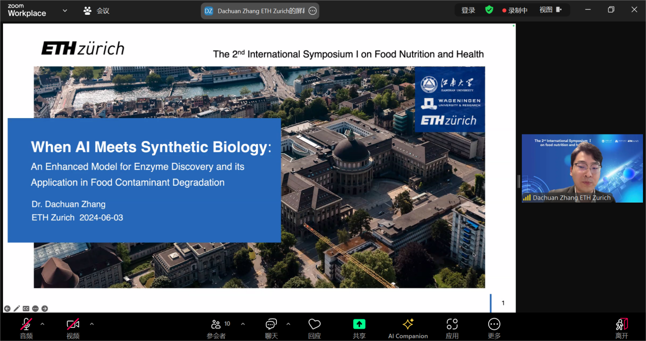 张大川博士作题为“When AI Meets Synthetic Biology: An Enhanced Model for Enzyme Discovery and its Application in Food Contaminant Degradation”的精彩报告。他首先介绍苏黎世联邦理工学院基本情况,其跻身全球最佳十所大学之列,培养了超过30多位诺贝尔奖得主。张大川主要从事食品大数据及机器学习相关领域,报告介绍了开发的新型PU-EPP模型,可以对酶的多样性进行预测,其AUC-ROC及AUC-PRC指数分别可以达到0.985和0.988。通过该模型,在29天成功筛选到了15个可以降解食品污染物的新型酶,其在食品科学研究中具有较广泛的应用场景。