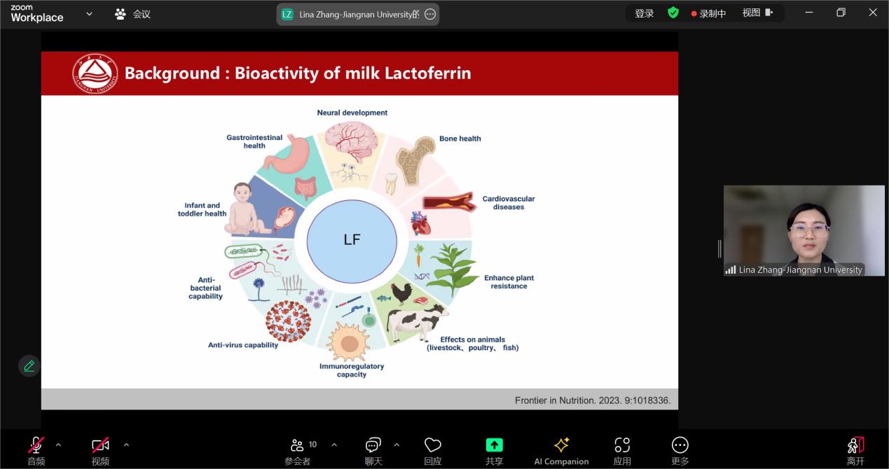针对乳中的关键功能成分—乳铁蛋白,张丽娜副教授为大家带来了关于“The structure and bioactivity of lactoferrin”的精彩报告。主要围绕乳铁蛋白的结构、其结构如何影响生物活性及其消化和吸收特性、怎样的消化度有利于提高乳铁蛋白的生物活性这一主旨进行了系统研究。报告指出,N-糖基化修饰可以提升乳铁蛋白的抗炎作用,保护乳铁蛋白抵御消化;低的铁饱和度有利于乳铁蛋白的抗炎和抗菌活性,而高的铁饱和度会增加乳铁蛋白的抗消化特性;适度的水解可以促进其抗菌活性。