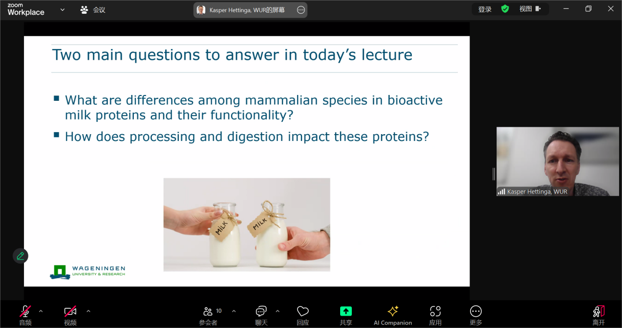 Kasper Hettinga教授为大家分享了题为“Bioactive proteins in milk from different mammals - variability and stability during processing”的主题报告。Kasper Hettinga教授分别就“不同哺乳动物乳源在活性成分及功能上存在什么差异”及“加工过程及体内消化如何影响乳源关键蛋白”两个问题展开阐述。他指出,不同哺乳动物的免疫活性蛋白数量相似但是组成和质量存在显著差异,这与不同物种的实际需求相关;热加工会造成活性蛋白的变性及聚集,而非热加工则可以使乳保留大多数的功能特性;此外,蛋白的消化可以调节其生理功能。