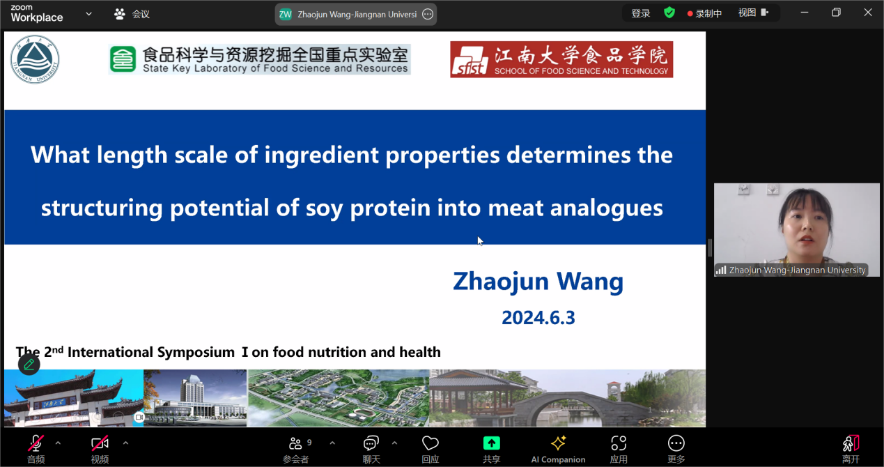 王召君副教授作题为“What length scale of ingredient properties determines the structuring potential of soy protein into meat analogues”的精彩报告。从大豆蛋白模拟体系出发,将影响原料蛋白的组成和结构进行拆分,揭示了在高水分挤压过程中,SPI结构中未变性蛋白、可溶性和不溶性聚集体以及氧化等共价交联体在蛋白纤维化过程中的作用机制差异。结果揭示了不溶性大豆蛋白聚集体是形成宏观纤维结构的关键结构元素,为高水分挤出产物结构和质量稳定性的合理调控提供了依据。