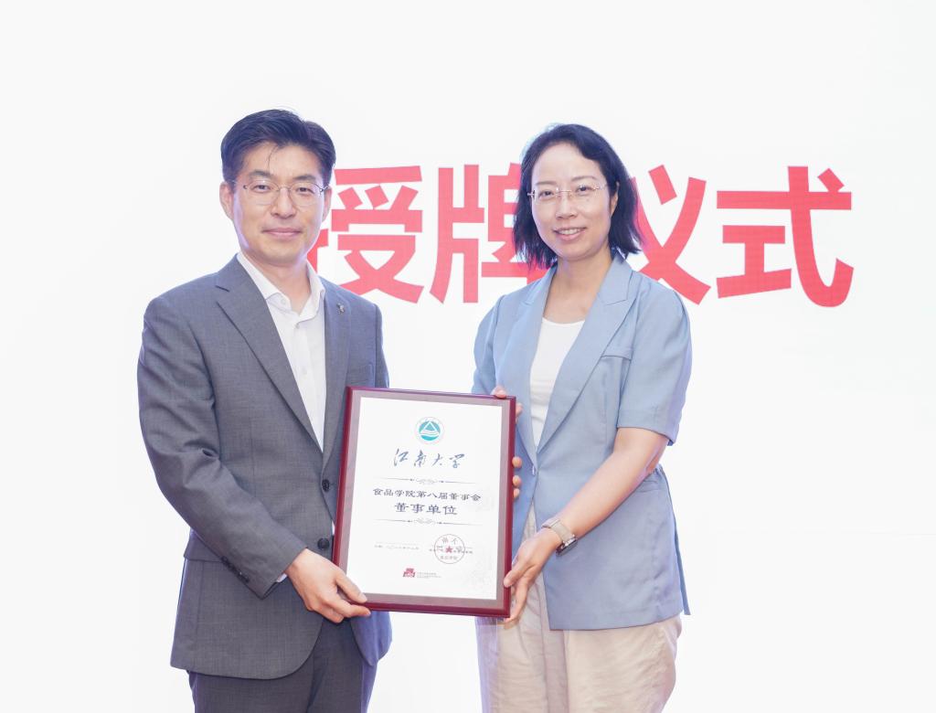 为感谢正官庄慷慨解囊,襄助江南大学食品学科竞赛育人等办学事业的高质量开展,食品学院第八届董事会吸纳正官庄为成员单位。傅莉莉为崔永锡颁授铭牌。