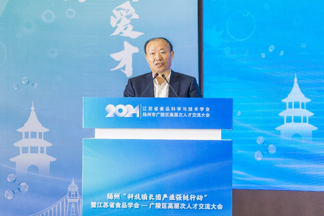 顾正彪在致辞中强调,当前江苏省食品行业管理部门和地方政府正在不断加强政策支持,加大研发投入,致力于培养创新人才,推动产业协同创新。江苏省食品科学与技术学会自成立以来,始终致力于推动江苏由“食品大省”向“食品强省”转变,通过学术交流等方式助力行业发展。2022年,长三角食品产业创新合作联盟扬州基地落户广陵,有力推动了园区企业技术创新。学会也将进一步发挥资源优势,深化与广陵合作,为推动食品产业高质量发展聚智汇力、赋能增效。