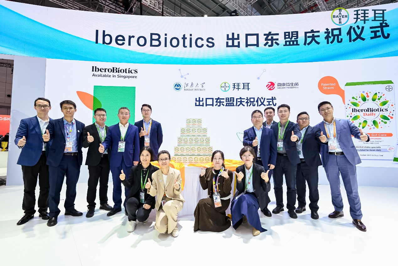 11月6日在第七届中国国际进口博览会,拜耳、江南大学、微康共同举办了IberoBiotics®益生菌出口东盟庆祝会,宣布三方联合开发、生产的IberoBiotics®益生菌产品于今年在新加坡成功上市,并计划在未来“出海”更多东盟国家。