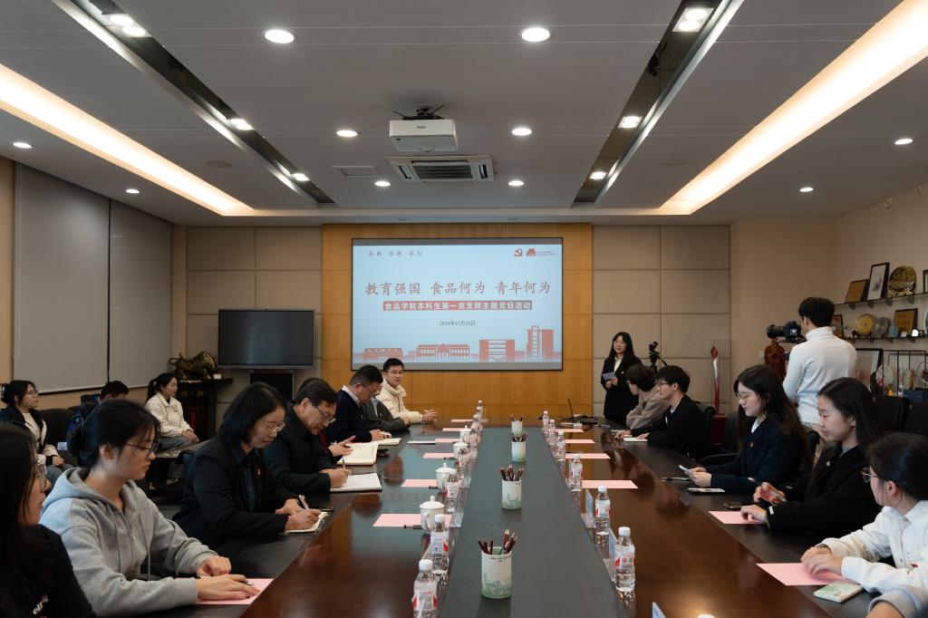 11月28日上午,食品学院本科生第一党支部举办“教育强国 食品何为 青年何为”主题党日活动。校党委书记吴正国,机关党委书记兼党委组织部副部长张菁,食品学院党委书记傅莉莉、副书记兼副院长李雷、党建辅导员与本科生第一党支部全体成员参加活动。活动由党支部宣传委员甘莹主持。