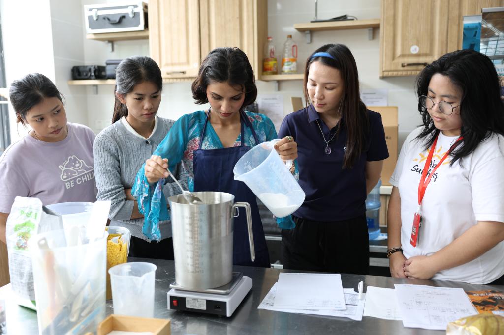 当天下午的实操课程将本次活动推向高潮。来自“一带一路”沿线国家的20余名青年学生分为5组,在专业老师的指导下制作芒果雪芭和开心果冰淇淋。活动现场香气四溢,同学们热情高涨,每一份冰淇淋都经过调配、均质、老化、凝冻、硬化等五个步骤方能呈现独特风味,最终形成完美作品。