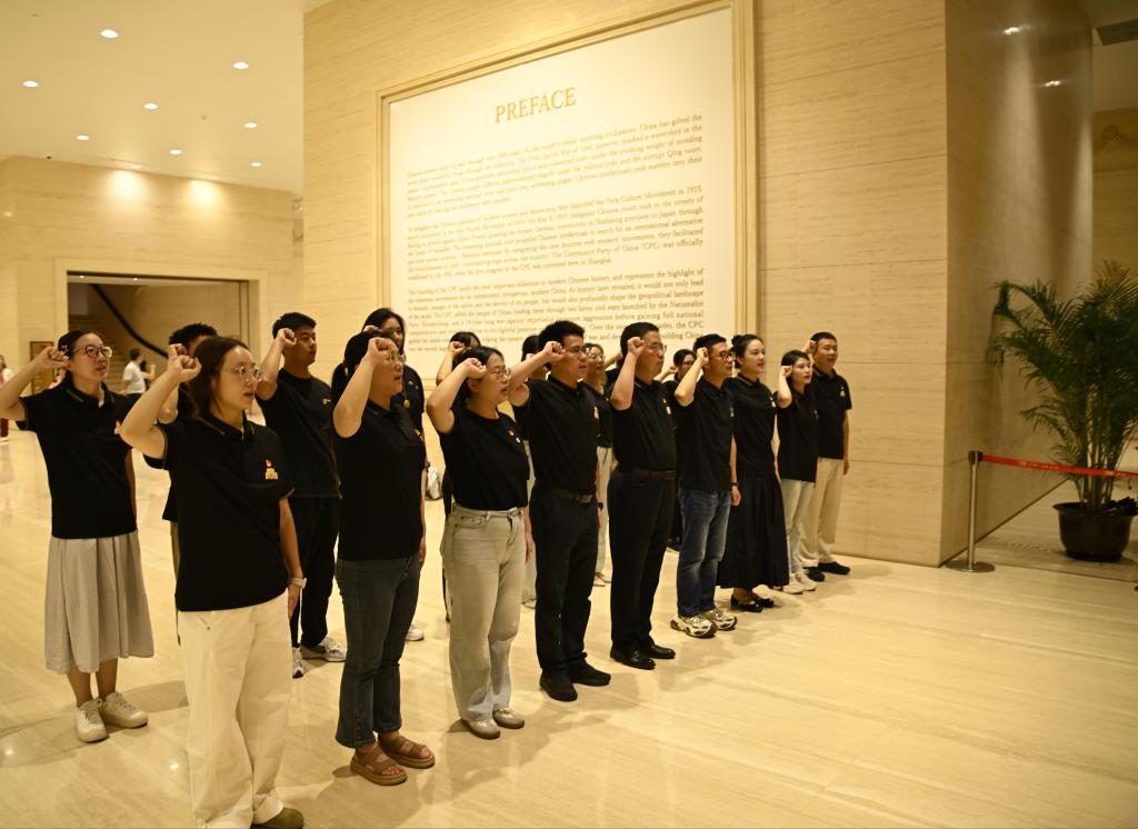 在沪期间,我校师生还前往中共一大会址纪念馆与钱学森图书馆开展主题党团日,在历史与科学的浸润中汲取奋进力量。在国家一级博物馆、全国爱国主义教育示范基地,位于黄浦区黄陂南路374号的中共一大会址纪念馆,大家通过聆听专业讲解,回顾了中国共产党从萌芽、诞生到发展壮大的光辉历程,体悟革命先辈为民族独立、人民解放矢志奋斗的崇高精神,深刻领悟伟大建党精神的形成与内涵。李雷带领党员师生面向党旗高擎右拳,重温入党誓词,进一步坚定为党和人民事业奋斗终身的理想信念。