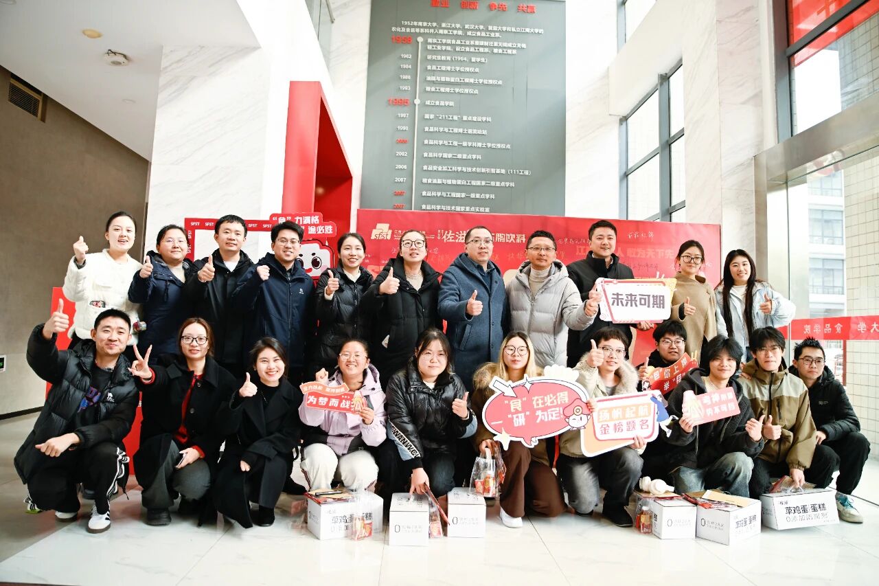 大厅入口处,“‘食’力满格,‘研’途必胜”主题展板格外亮眼。学子们纷纷驻足,执笔写下心中的滚烫心愿与奋斗誓言:“一战成硕,不负韶华”“全力以赴,奔赴理想”;也有同窗间的温情祝福:“愿我们顶峰相见”“一研为定,未来可期”。展板前的身影与笑容,共同拼贴出这个冬天最动人的青春画卷。