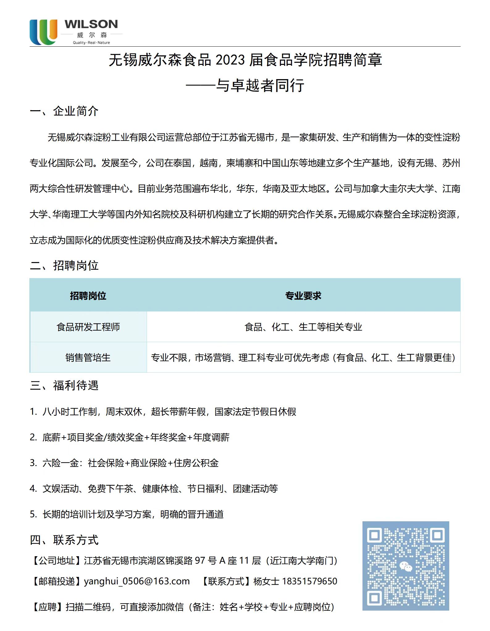 就业 【2023】 48号 无锡威尔森食品招聘简章