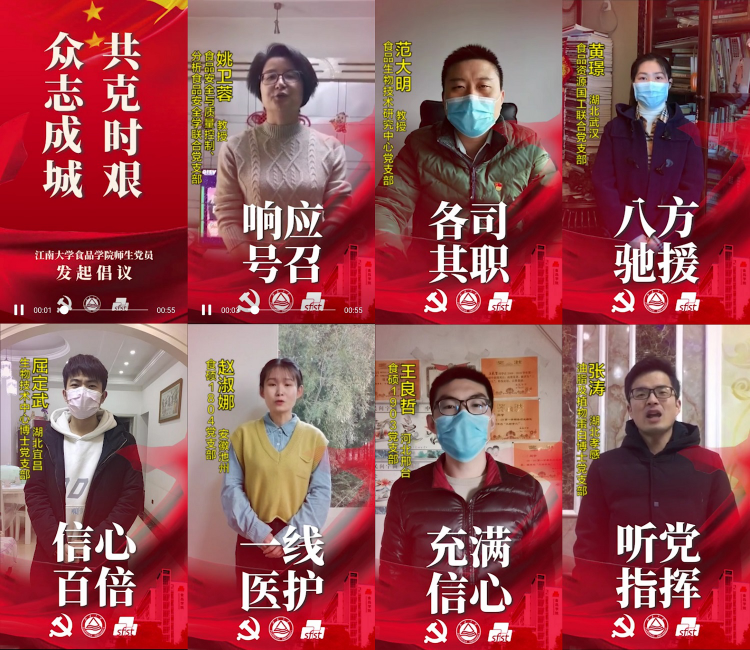 食品学院全体师生尽自己所能,主动开展各类各式宣传工作,传播抗疫正能量。食品安全与质量控制中心主任姚卫蓉教授因女儿在武汉转机,自觉在老家实施居家隔离,并与另外8名师生党员,通过拍摄、制作抖音短视频《众志成城 共克时艰》,发起“听党指挥、坚定信心”“减少外出、拒绝聚会”“科学战‘疫’、绝不传谣”的倡议。短视频一经上线,收到校内外、食品行业人事点赞、转发,播放量近3万。食品学院新媒体工作室发起“武汉加油”的食品专属头像接力,短短4小时,参与人数超过5000人次。